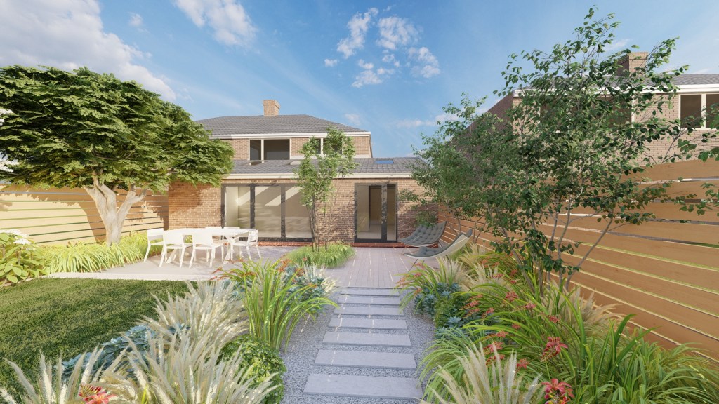 Take a typical British lawned oblong and create a South African sunseeker’s haven with terraces for morning, noon and night. Brought together with abundant low-maintenance planting for year-round interest.