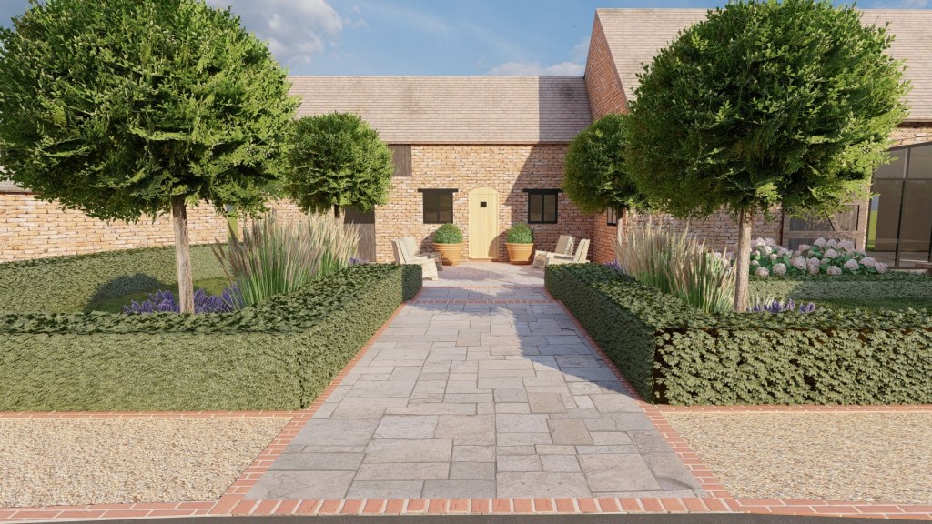 Welcoming lollipop trees, evergreen hedging and a pair of oversize terracotta pots complete the statement.